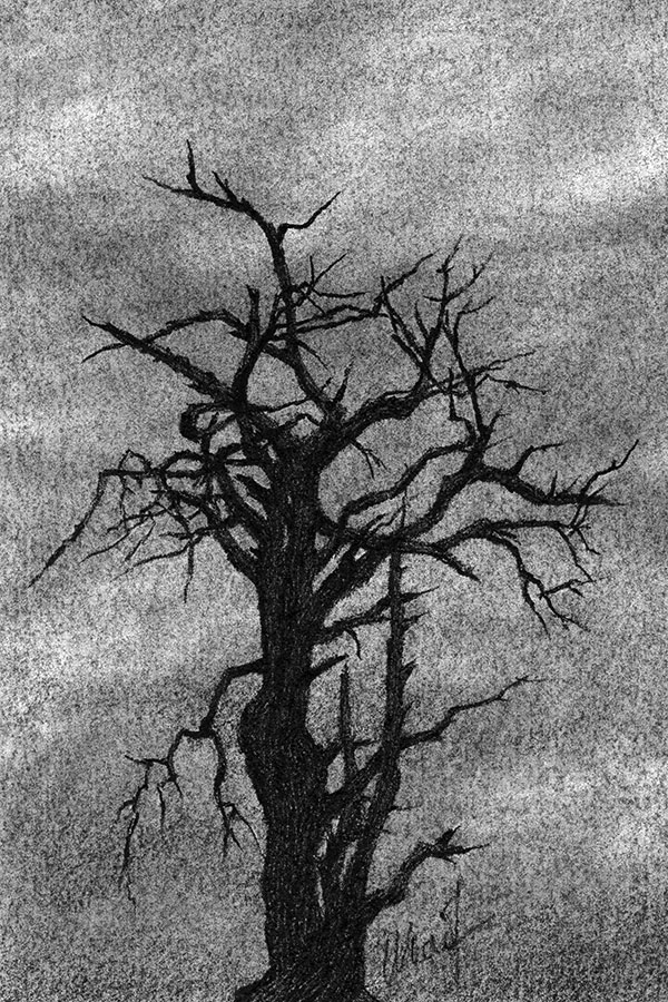 One of my very favorite things to draw after horses are dead trees in different stages of returning back to elements. This one still holds up pretty well, a final testament to how high and wide it managed to reach in its lifetime.