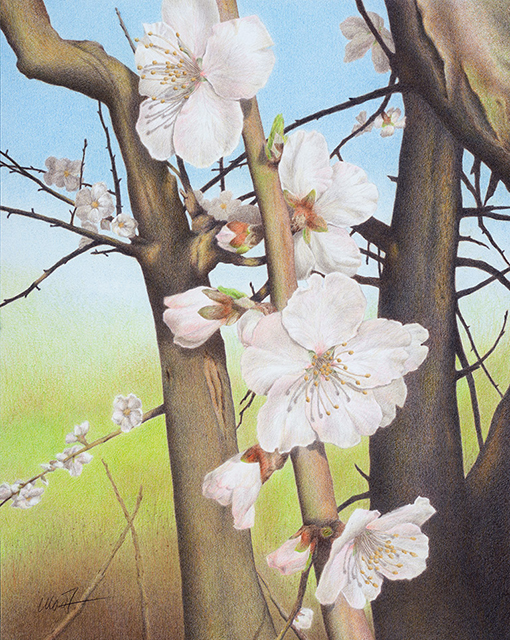 Plum Blossoms in Los Gatos Creek Park – colored pencil, 16″ x 20″